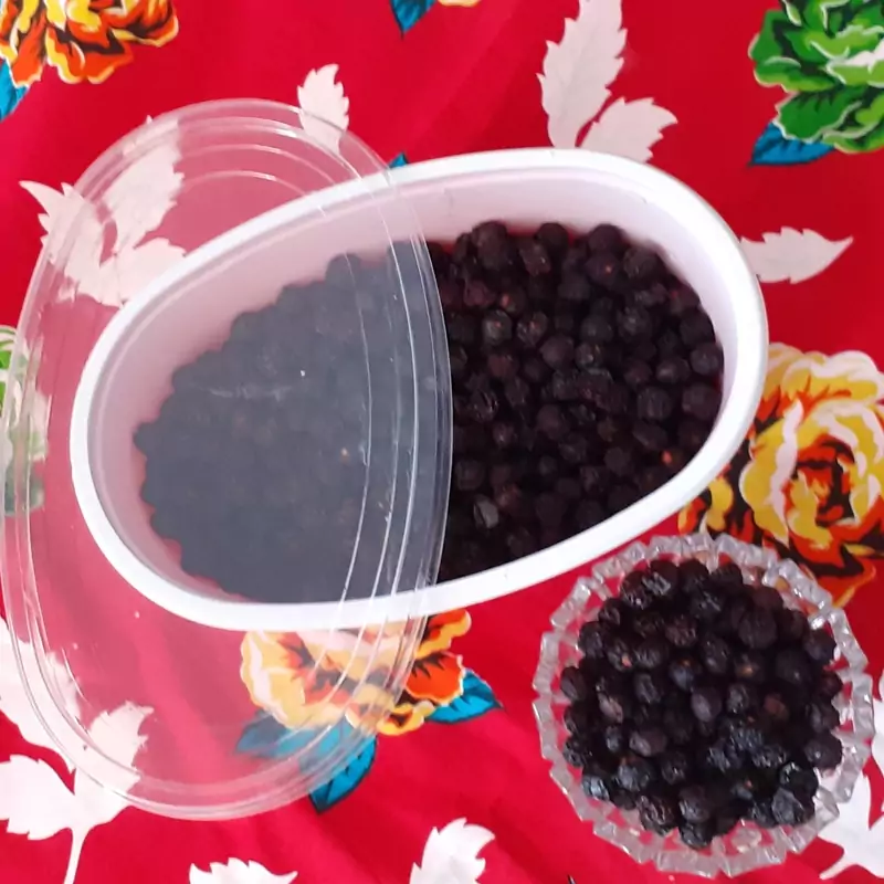 از آلبالوها ی باغ خودمون هستش که به صورت دست چین چیده و خشک کردیم و بدون اینکه کاملا خشک بشه و آبش گرفته بشه و بسوزه جلو آفتاب جمع کردیم و بعد شستشوی دوباره و یه روز آفتاب دادن تو یخچال نگه داری کردیم