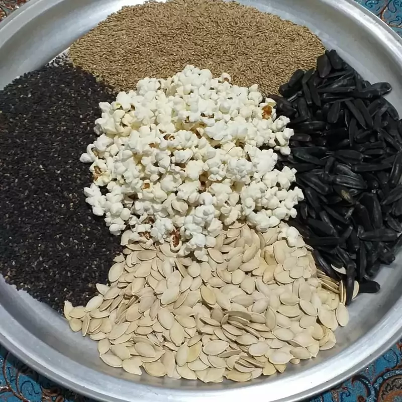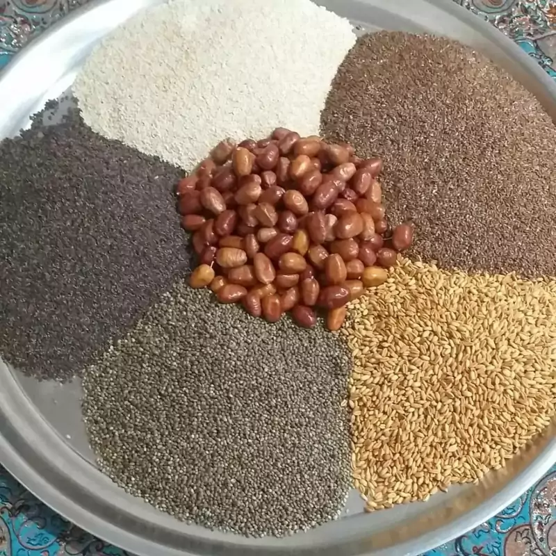 سلام وقت بخیر ترکیبات پودر معجون سنجد کنجد سیاه و سفید ّبذر کتان بزرک دانه سویا تخمه کدو و آفتابگردان شاهدانه ذرت خرما کشمش مویز انجیر و توت خشک گندم زنجبیل دارچین زیره تخم گشنیز گل سرخ هل