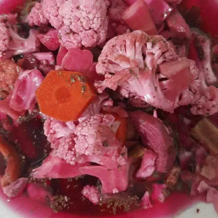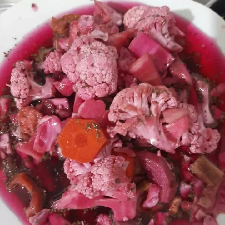 ترشی هفته بیجار ما از مخلوط سبزی های معطر و گل کلم و هویج و لبو و خیار درست شده زمان کافی برای عمل آوری بهش داده شده و با توجه به اینکه اکثرا ترشی مخلوط رو با برش های متوسط مواد تشکیل دهنده ی اون دوست دارن سعی کردیم سلیقه ی عموم رو در نظر بگیریم همون طور که تو تصویر مشخص هستش لبو هم رنگ خوشی به ترشی داده و همراه سبزی های معطر خوش عطر و خوش مزه شده